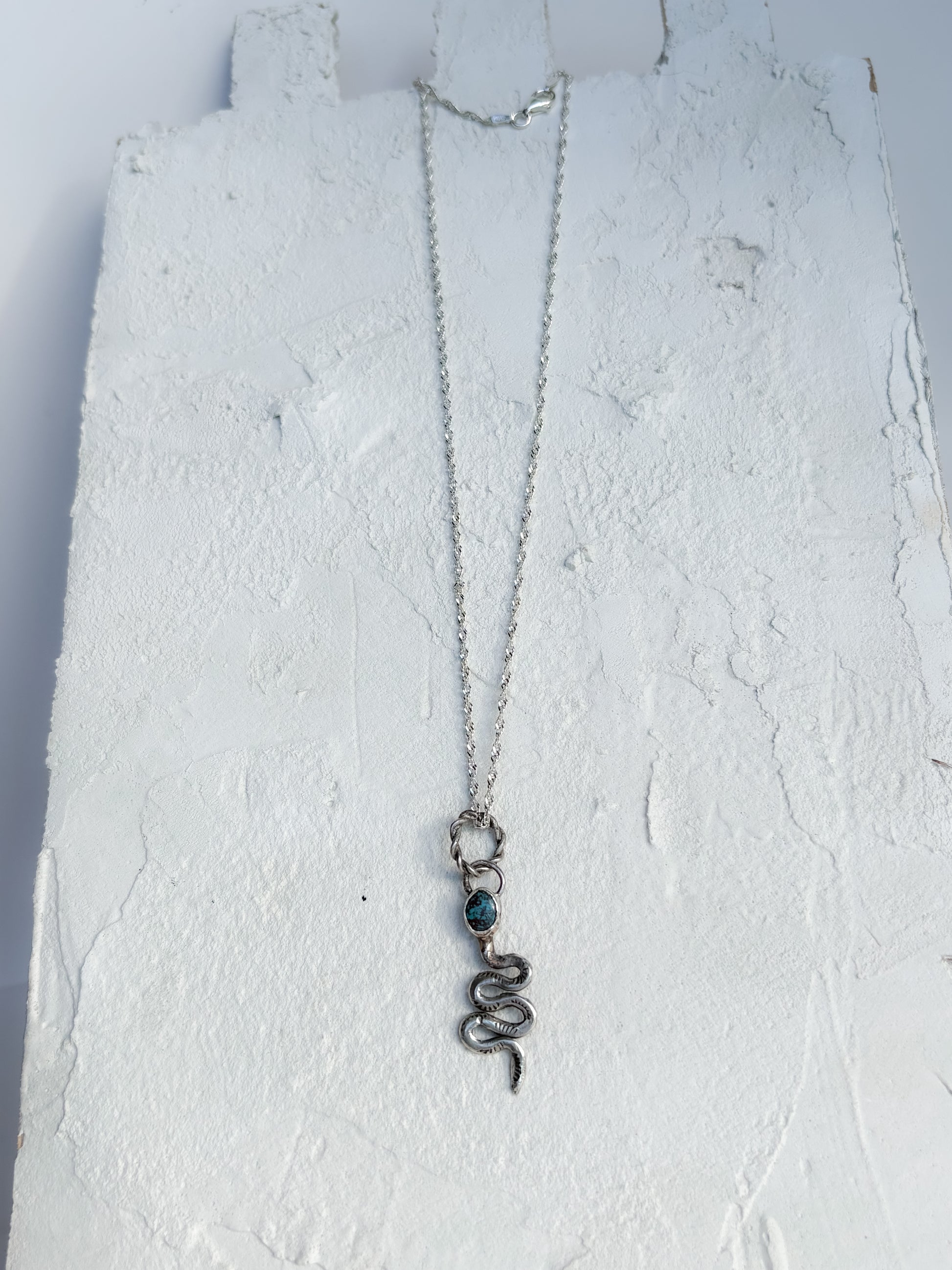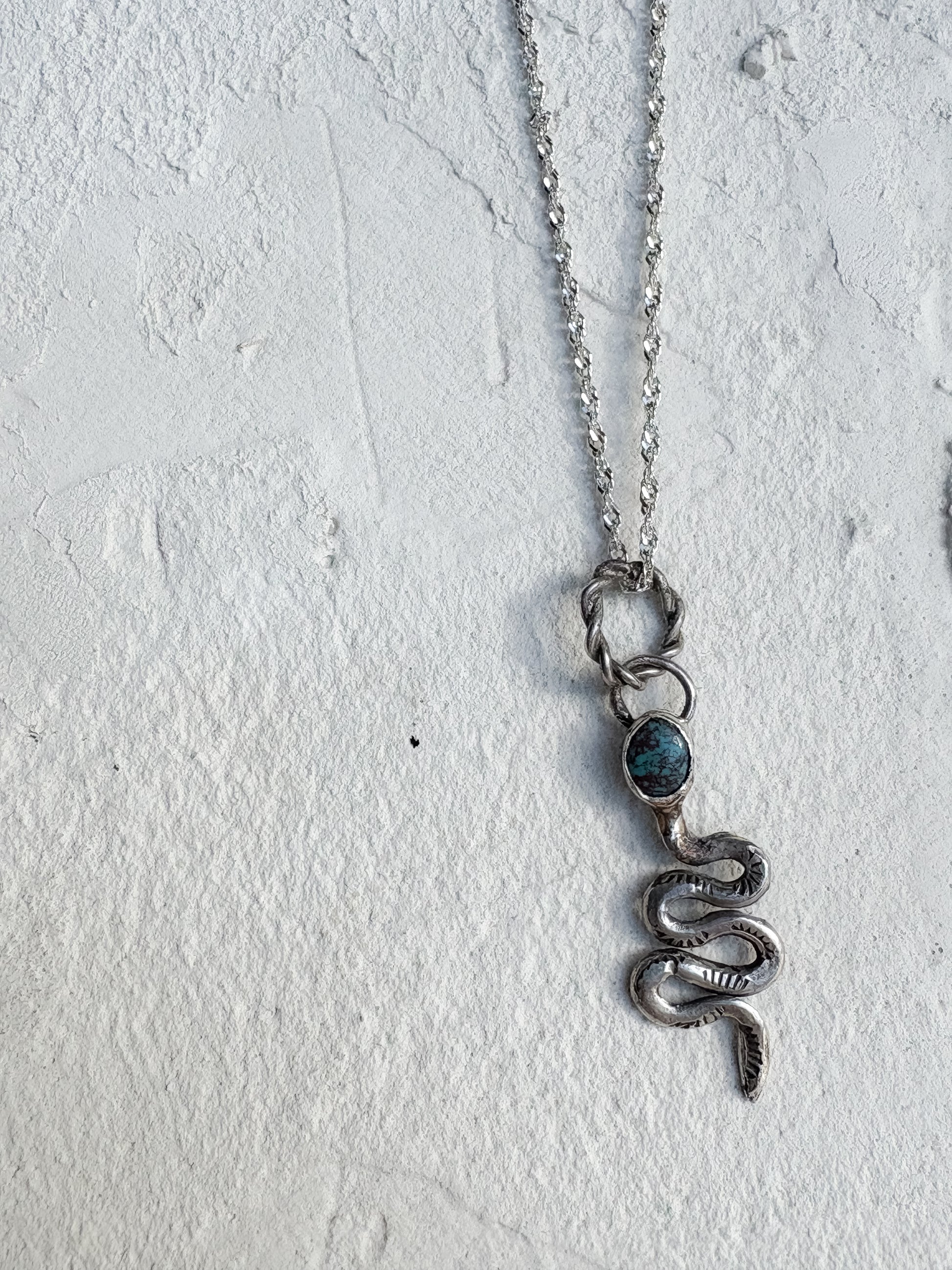 Forged in sterling silver and crowned with a Kingman turquoise stone, the Rebirth Necklace honors the ancient symbol of the serpent — a quiet guardian of transformation, healing, and renewal. Hand stamped in flowing lines, the serpent coils below a brilliant turquoise gem, sourced from the legendary Kingman mine of Arizona. Each stone carries the vibrant blues and desert veins of the American Southwest, echoing the strength found in cycles of change.